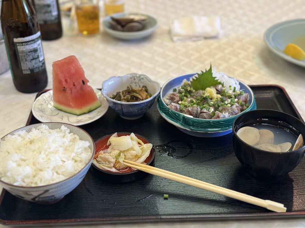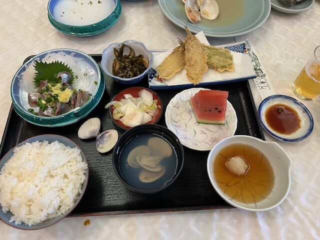 それにしても豪華な料理、焼きハマグリ、なめろう,鰯の刺身に天ぷら